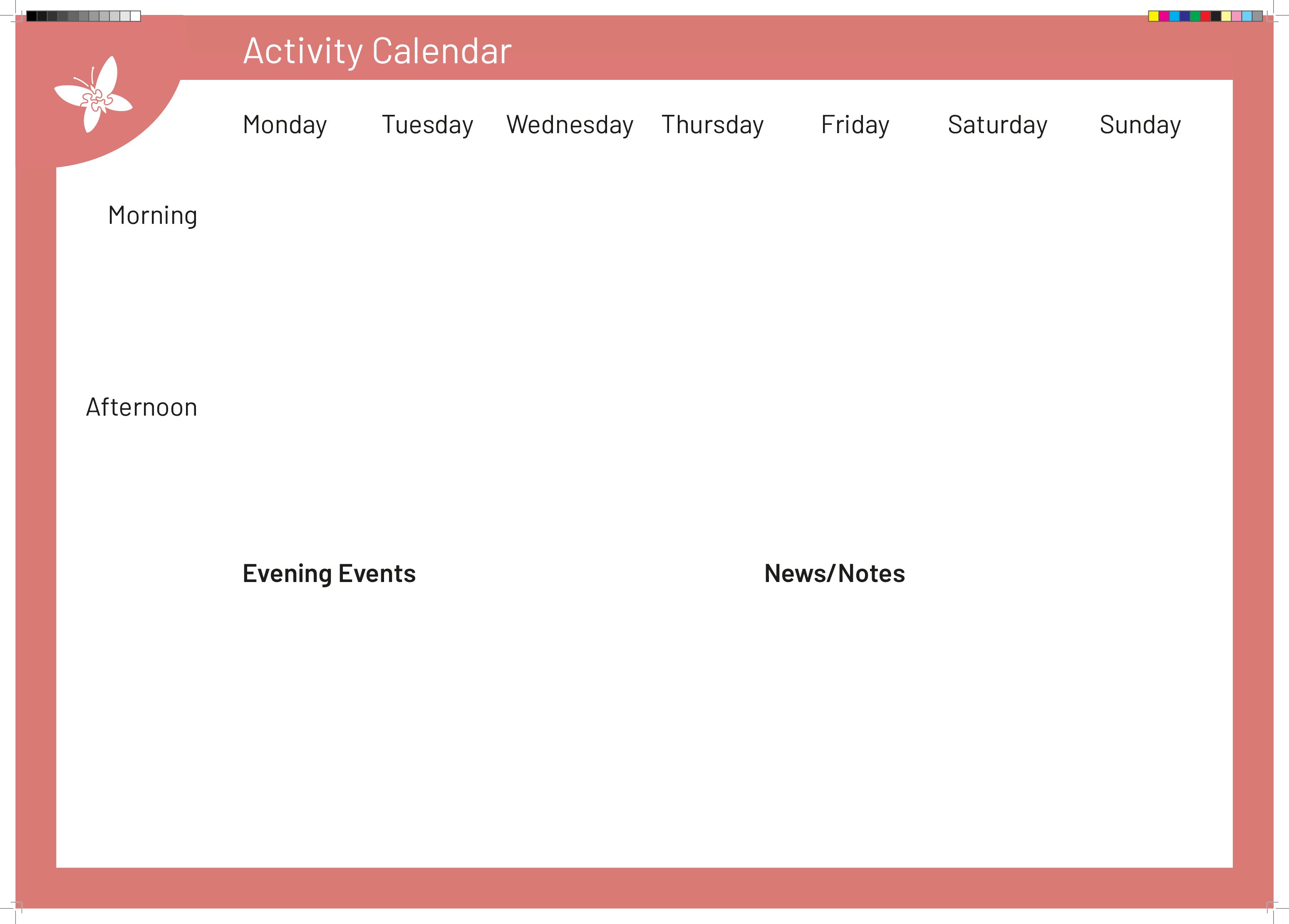 Displayed in a care home reception area or day centre hall, this Activity Calendar will not only be an attractive wall display but a very practical way of spreading your good news.